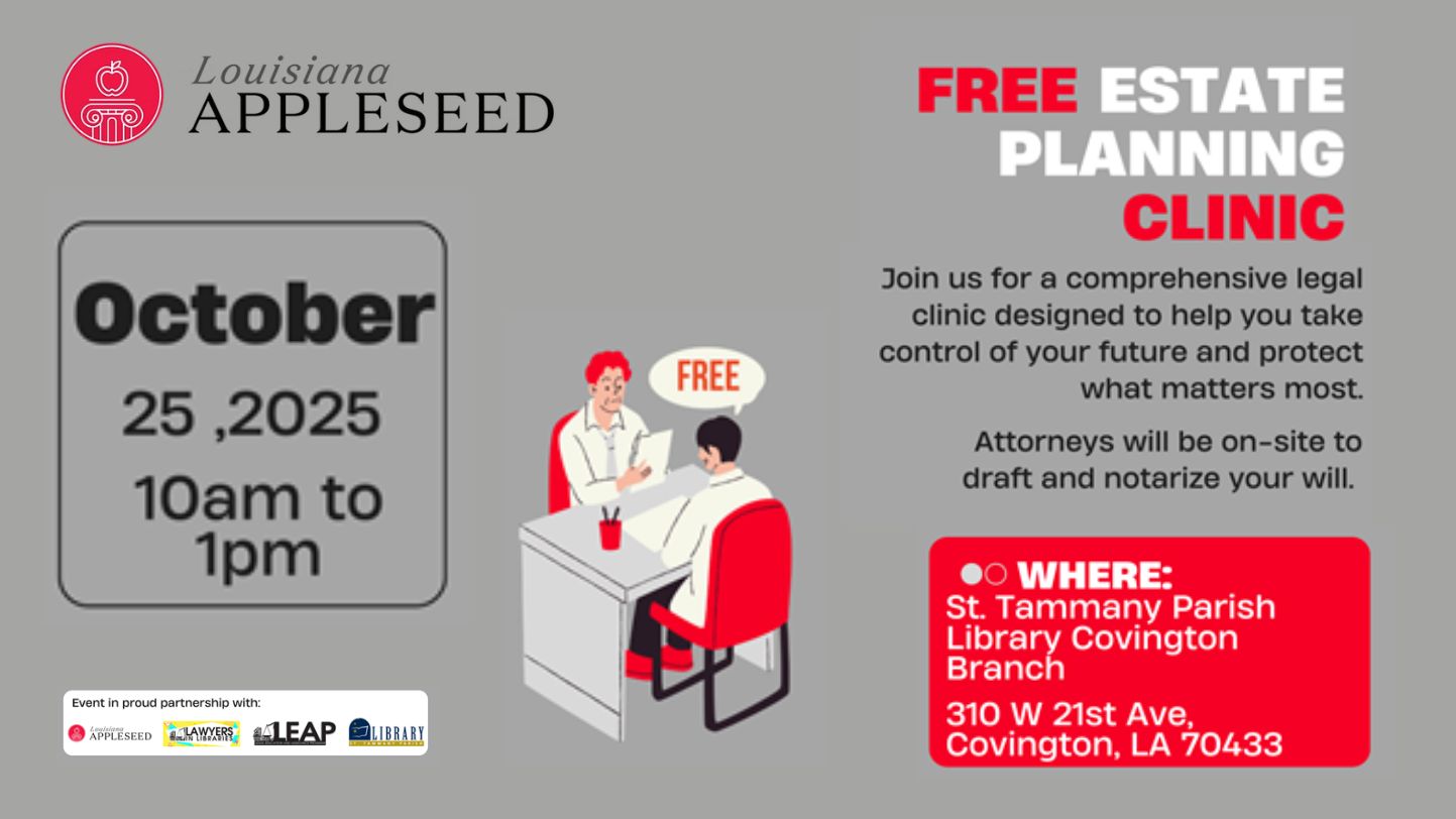 October 25 @ 10:00 am - 1:00 pm Securing Your Legacy: A Will Writing Clinic Covington Branch | St. Tammany Parish Library